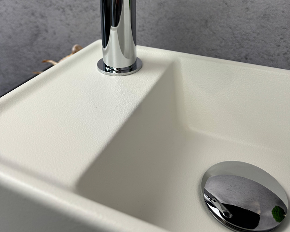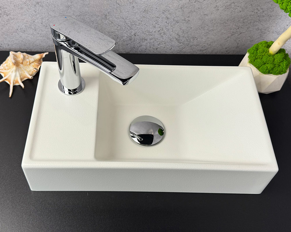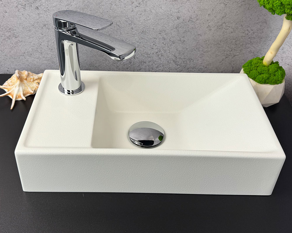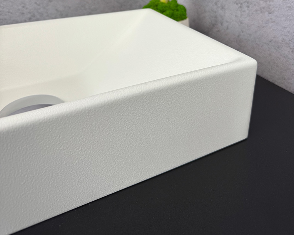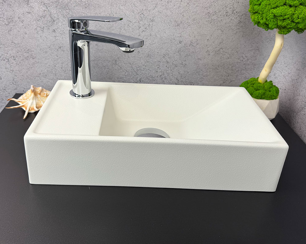 Колір умивальника-матовий білий.Він має рівномірну, світлу текстуру, яка виглядає трохи зернистою або негладкою на зовнішній стороні. Це чистий, нейтральний відтінок, який добре контрастує з темною поверхнею, на якій він стоїть.