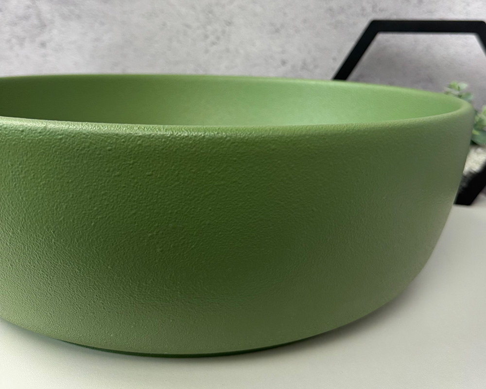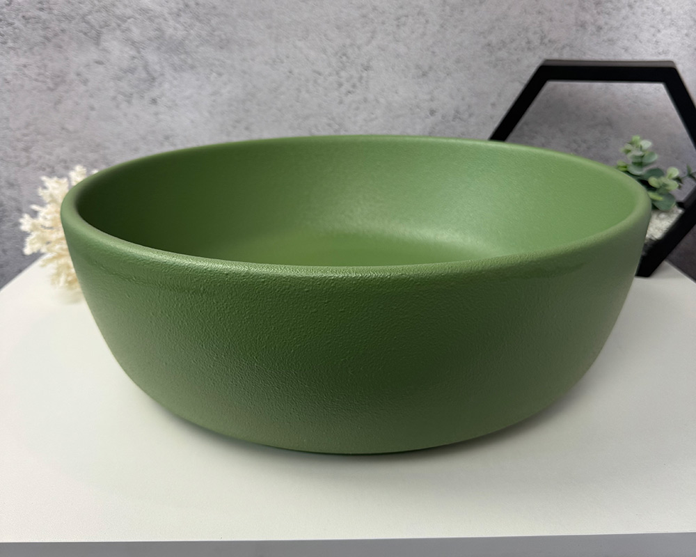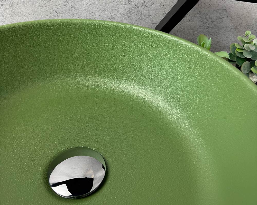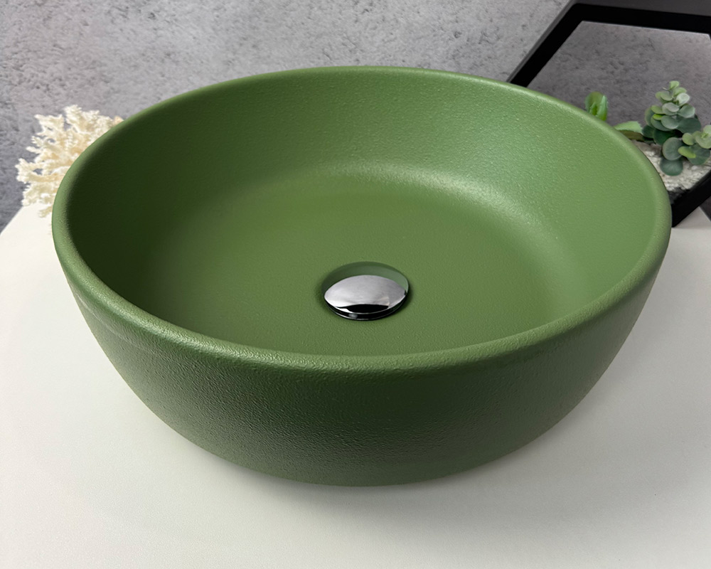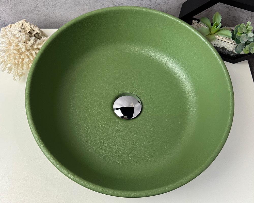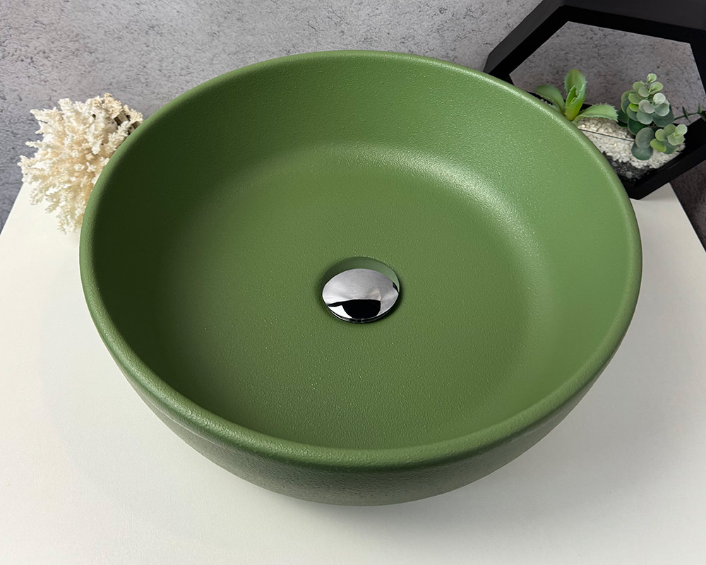 Умивальник має приємний, насичений зелений колір, що нагадує відтінок оливкової або трав’яної зелені. Поверхня матова, із легкою текстурою «шагрень», яка додає йому глибини та сучасного вигляду. Колір виглядає природно й гармонійно, чудово поєднуватиметься з нейтральними або натуральними тонами в інтер’єрі.